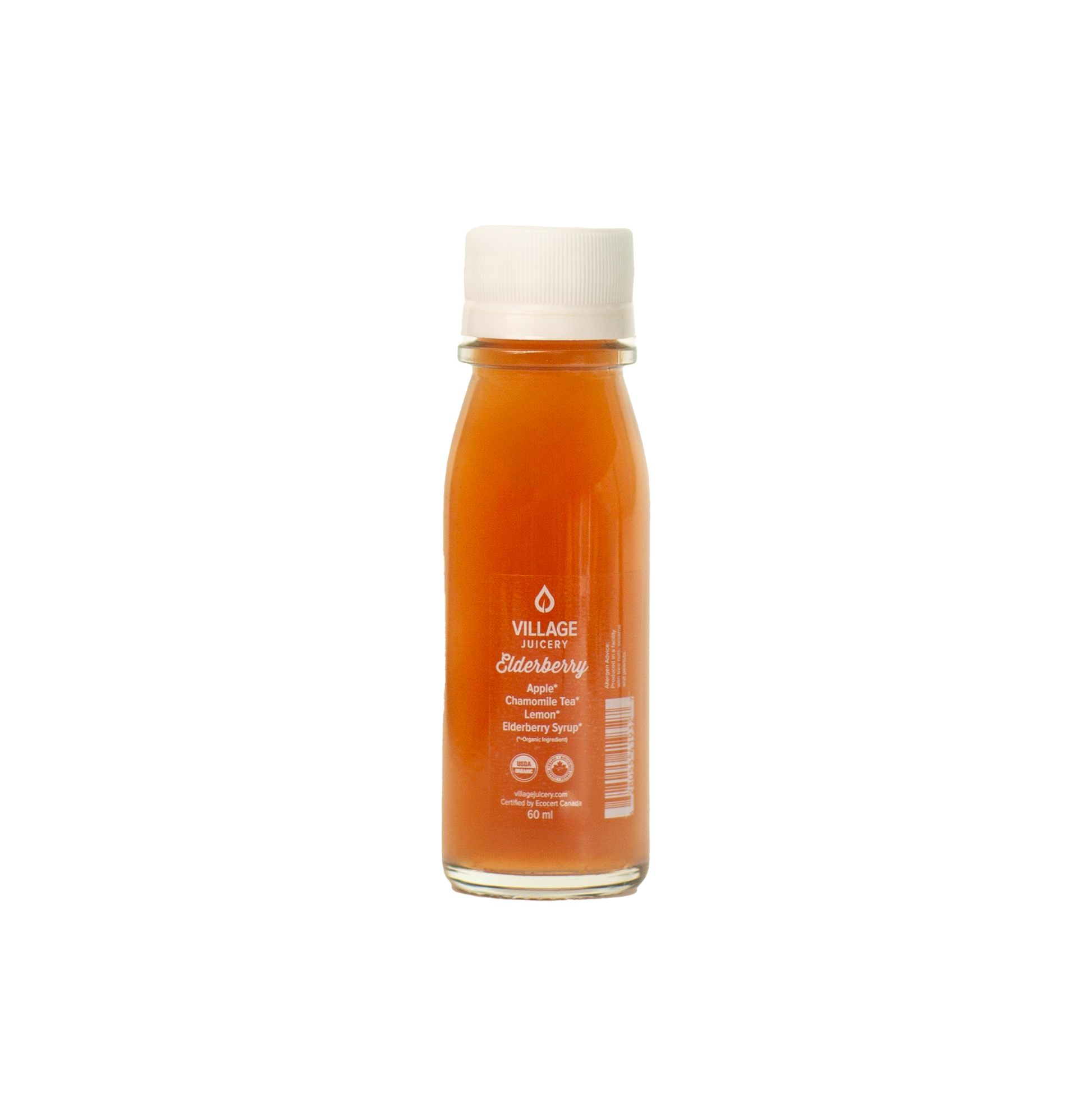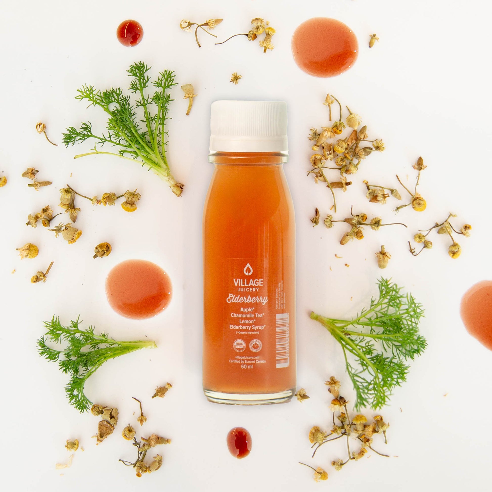 This shot is restorative and soothing to treat the sniffles. Calming chamomile and antioxidant rich elderberry bring balance back to your day. Raw, cold pressed organic.