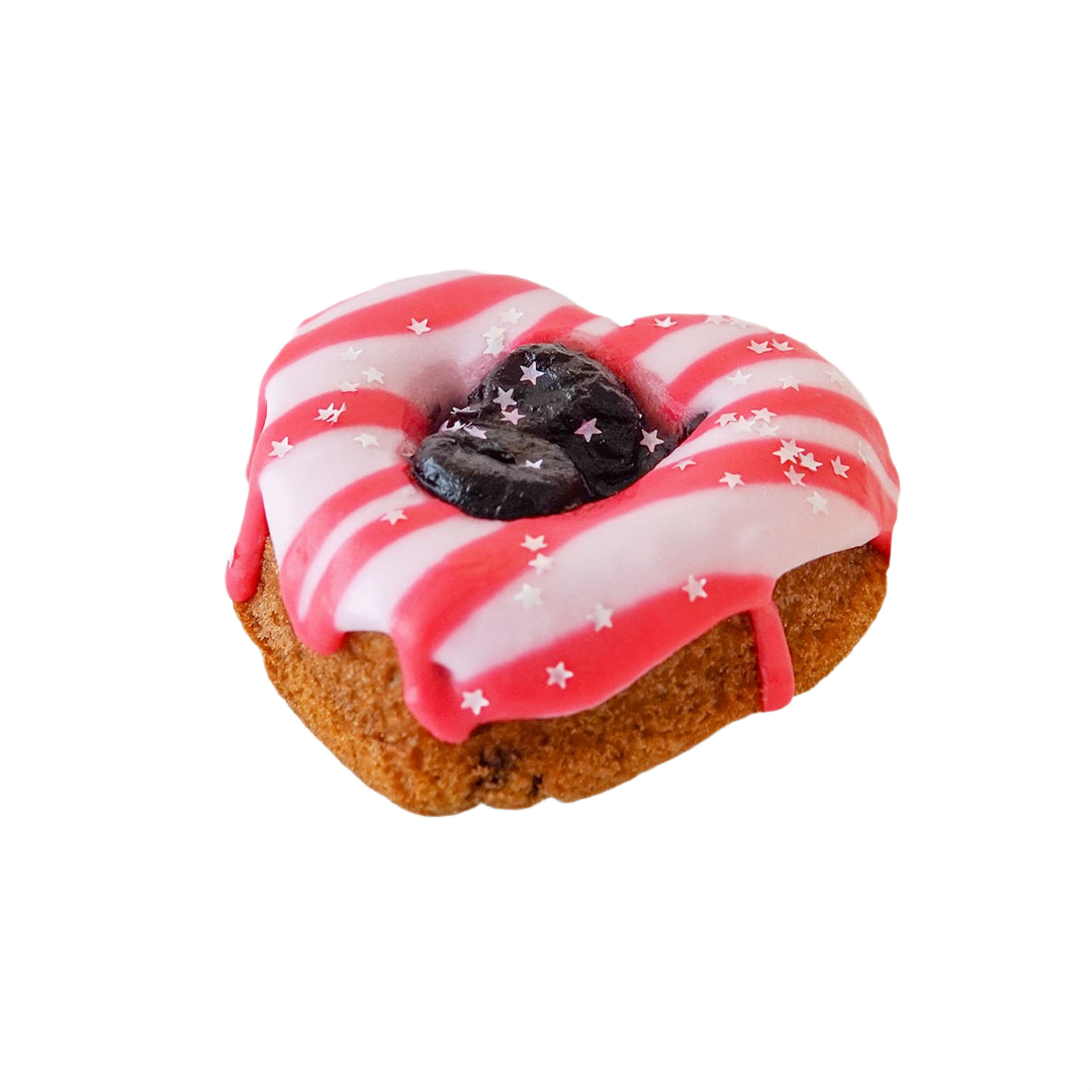Heart-shaped cherry donut with jewelled cherry core, a light pink vanilla creme glaze and a drizzle of our signature pink dip.