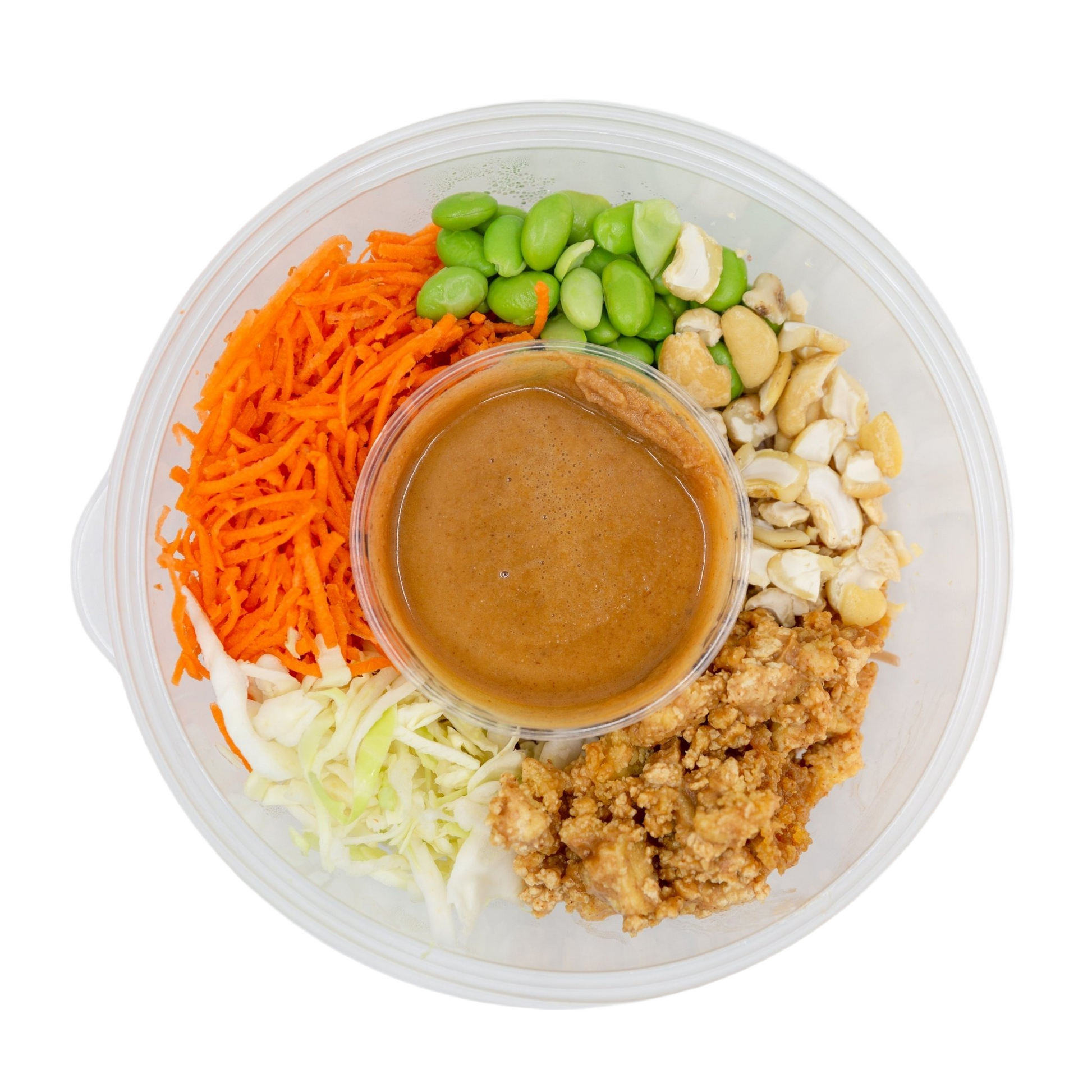 Our organic Soba Noodle Bowl is paired with our Peanut Lime dressing and includes peanut butter baked tofu crumble, edamame and toasted cashews on a bed of buckwheat soba noodles.